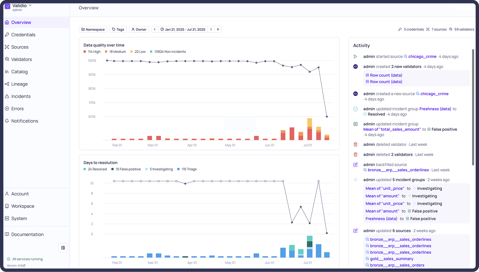 In fast-moving data environments, it’s not enough to know that incidents are happening—you need to understand where, when, and how they affect your business. In Validio 5.2, we’ve completely redesigned the overview dashboard and on-page graphs to easily track data quality KPIs over time. The overview dashboard gives a direct snapshot of data quality over time, how quick incidents are resolved, and what the latest activity is.